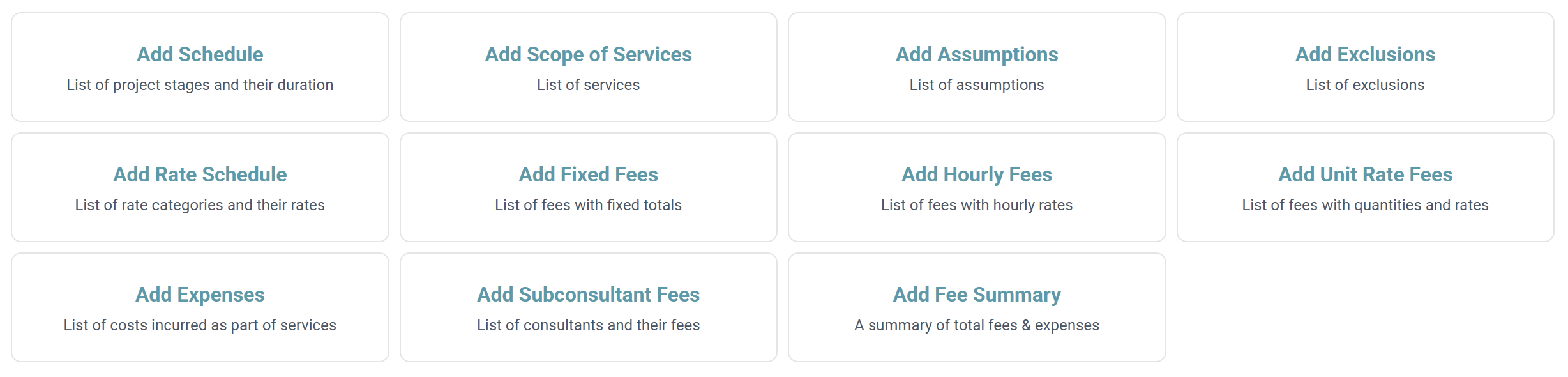 All previous elements included in proposals have been converted into sections (eg. fee summary, assumptions and exclusions, rate schedule, subconsultants etc.)