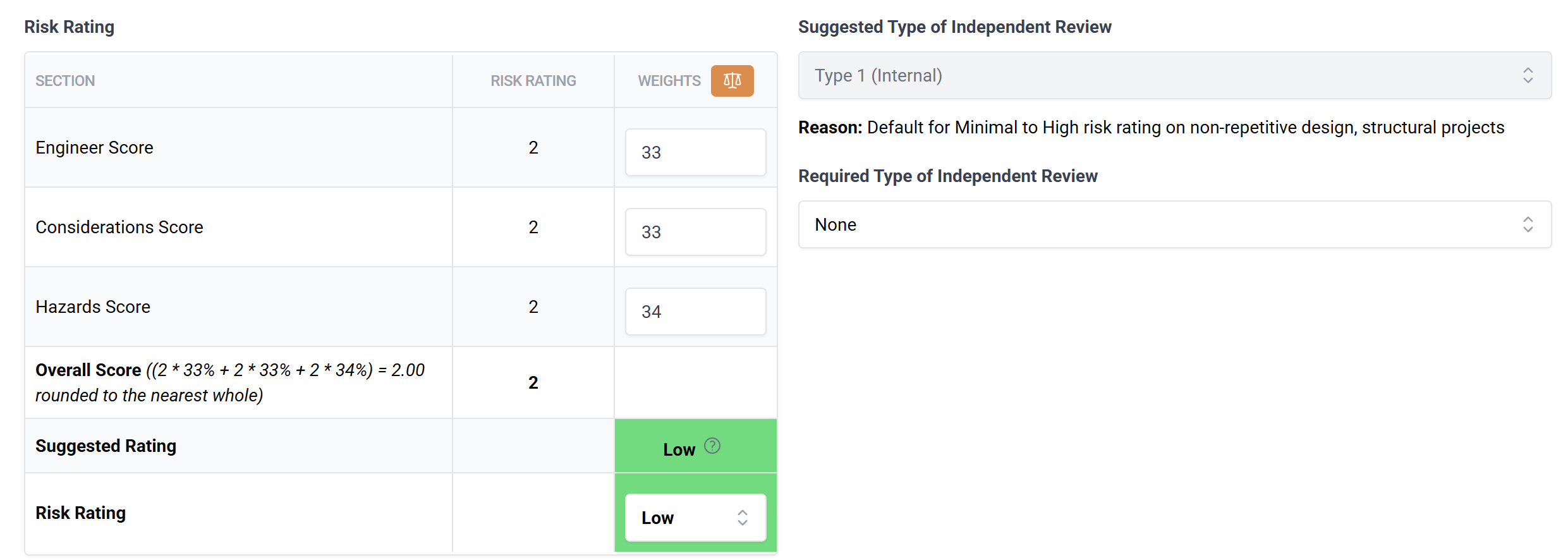 Allow users to change the risk assessment rating/score as needed and override the suggested level of Independent Review required