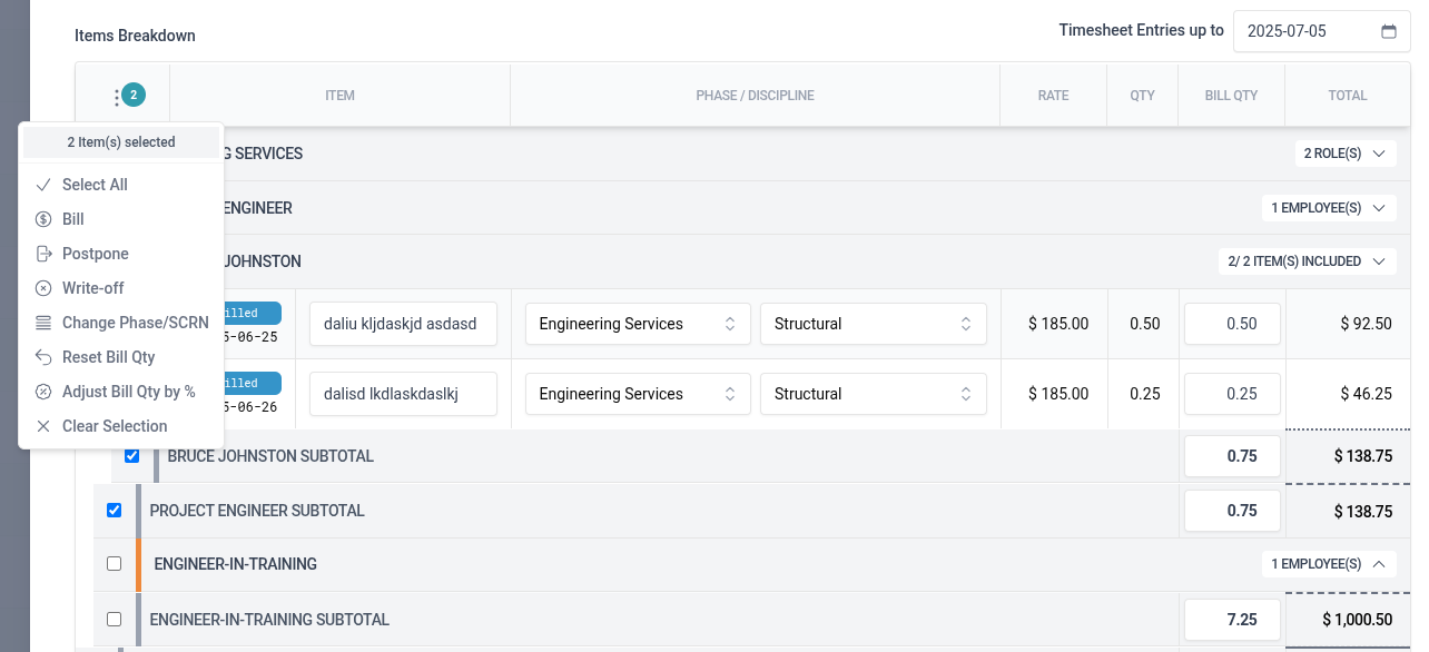Add the ability to perform bulk actions like bill/postpone/writeoff as well as change Phase or Adjust Bill Qty on selected items