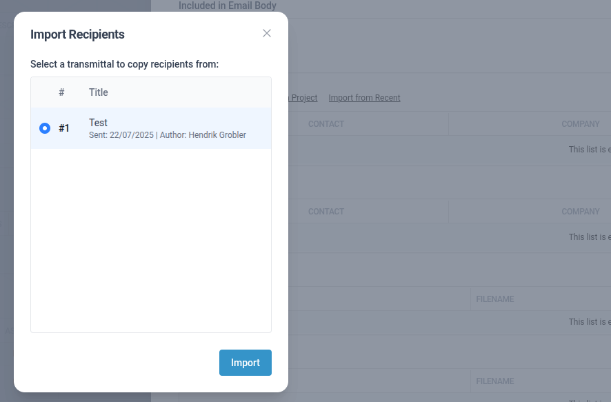 Replaced “Import from last Transmittal” button on Transmittal creation with “Import from recent Transmittal” which let you choose a Transmittal to import contacts from